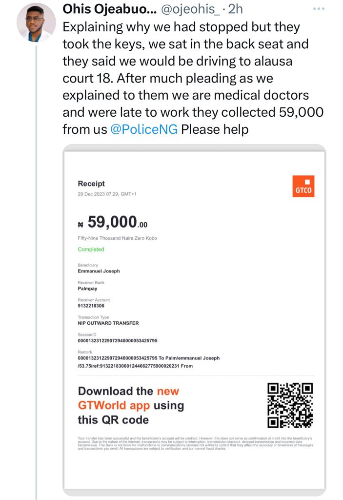 A medical doctor, Ohis Ojeabuo has cried out on social media after some police officers in Lagos state allegedly extorted N59,000 from him and his colleagues.